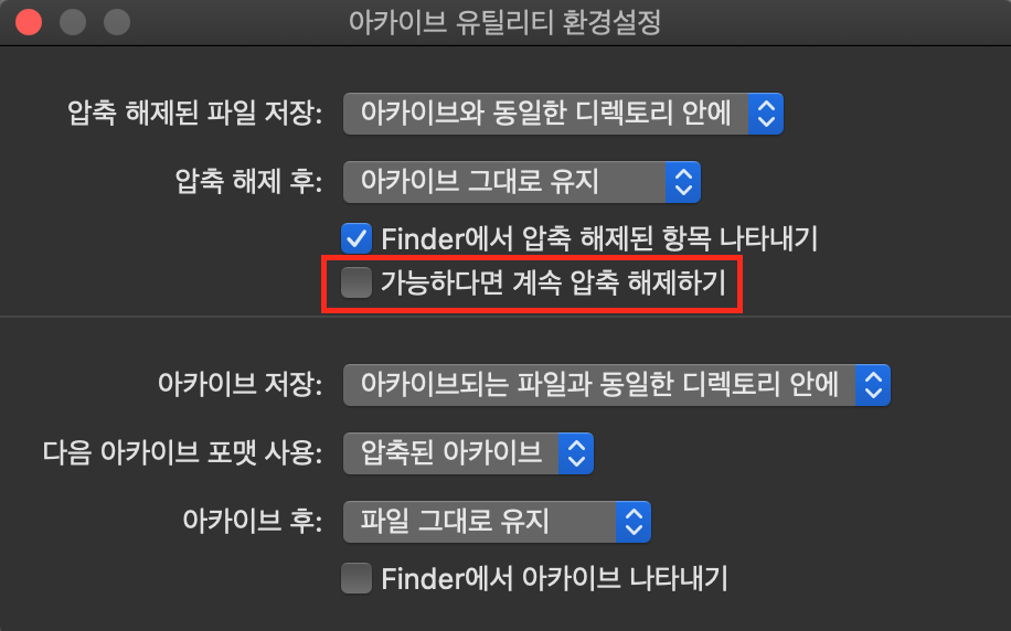 중간에 "가능하다면 계속 압축 해제하기"를 체크 해제해줍니다.