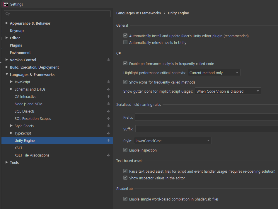 [File]->[Settings] (단축키 Ctrl+Alt+S) 로 들어가서 Unity Engine을 찾습니다.