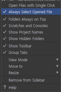 해당 설정창을 눌러주면 아래와 같은 메뉴가 나오는데, 여기서 Always Select Opened File을 선택한다.