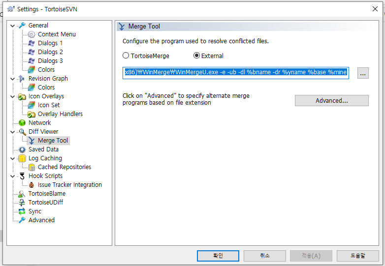 TortoiseSVN 설정창에서 [Diff Viewer]->[Merge Tool]에 *External 선택 후 아래와 같이 입력해줍니다.