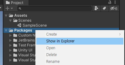 유니티에서 Packages 폴더를 [마우스 우클릭]->[Show in Explorer]로 바로 갈 수 있습니다.