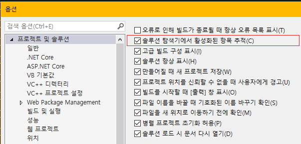 Visual Studio 상단 메뉴에 [도구]->[옵션]->[프로젝트 및 솔루션]->[솔루션 탐색기에서 활성화된 항목 추적]에